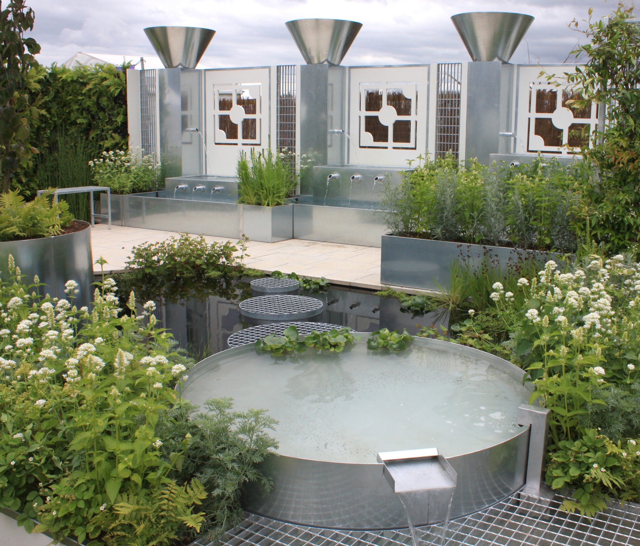 Maggie's Water Garden was designed by Amanda Waring and Laura Arison for Maggie's Cancer Care Trust Centre as a place to sit and reflect. This garden won a Silver-Gilt medal.